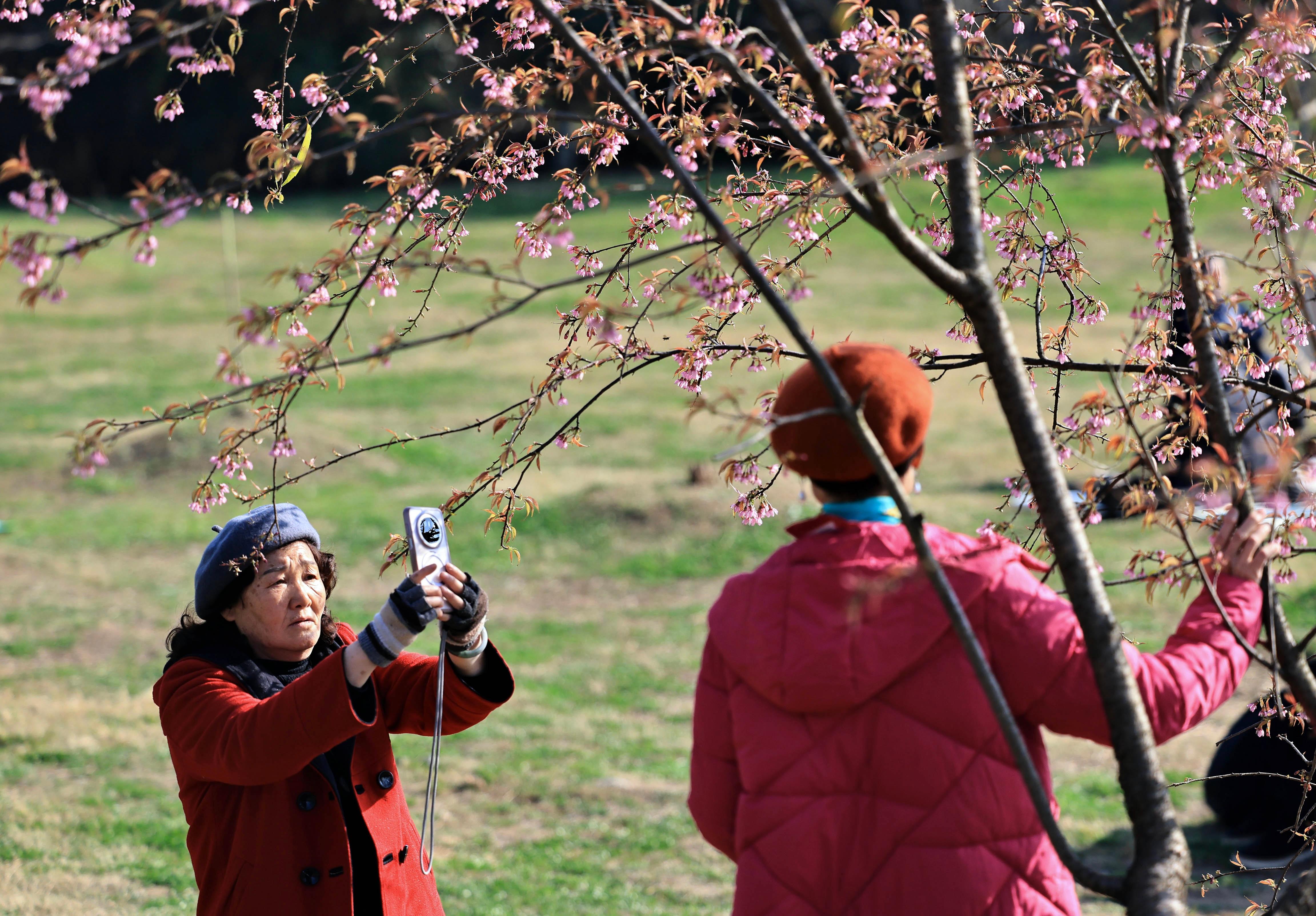1月6日,成都市青龍湖公園的冬櫻花開(kāi)放,吸引游人前來(lái)賞櫻花、享暖陽(yáng)。圖為市民在櫻花樹(shù)下拍照。中新社記者 王磊 攝