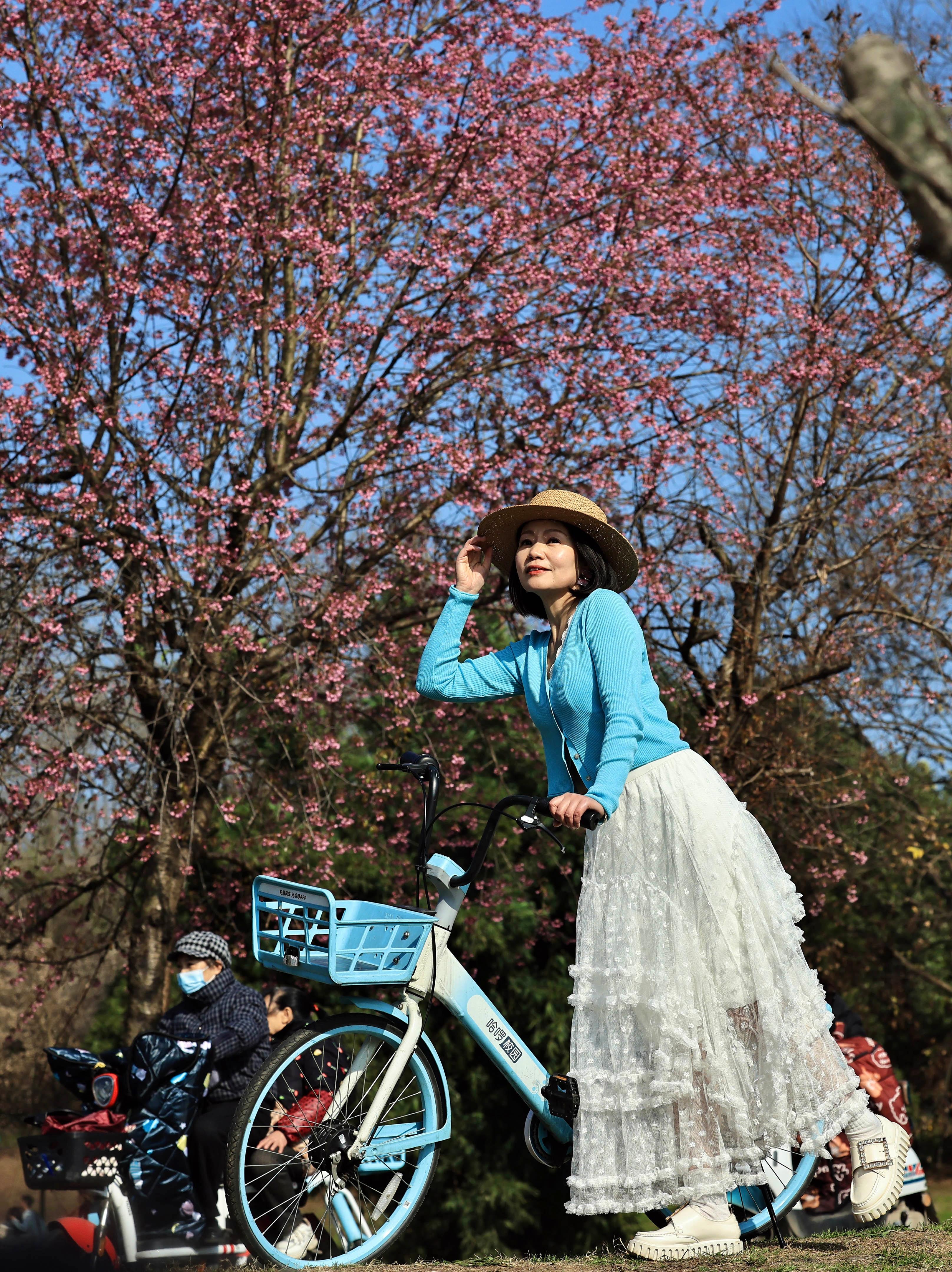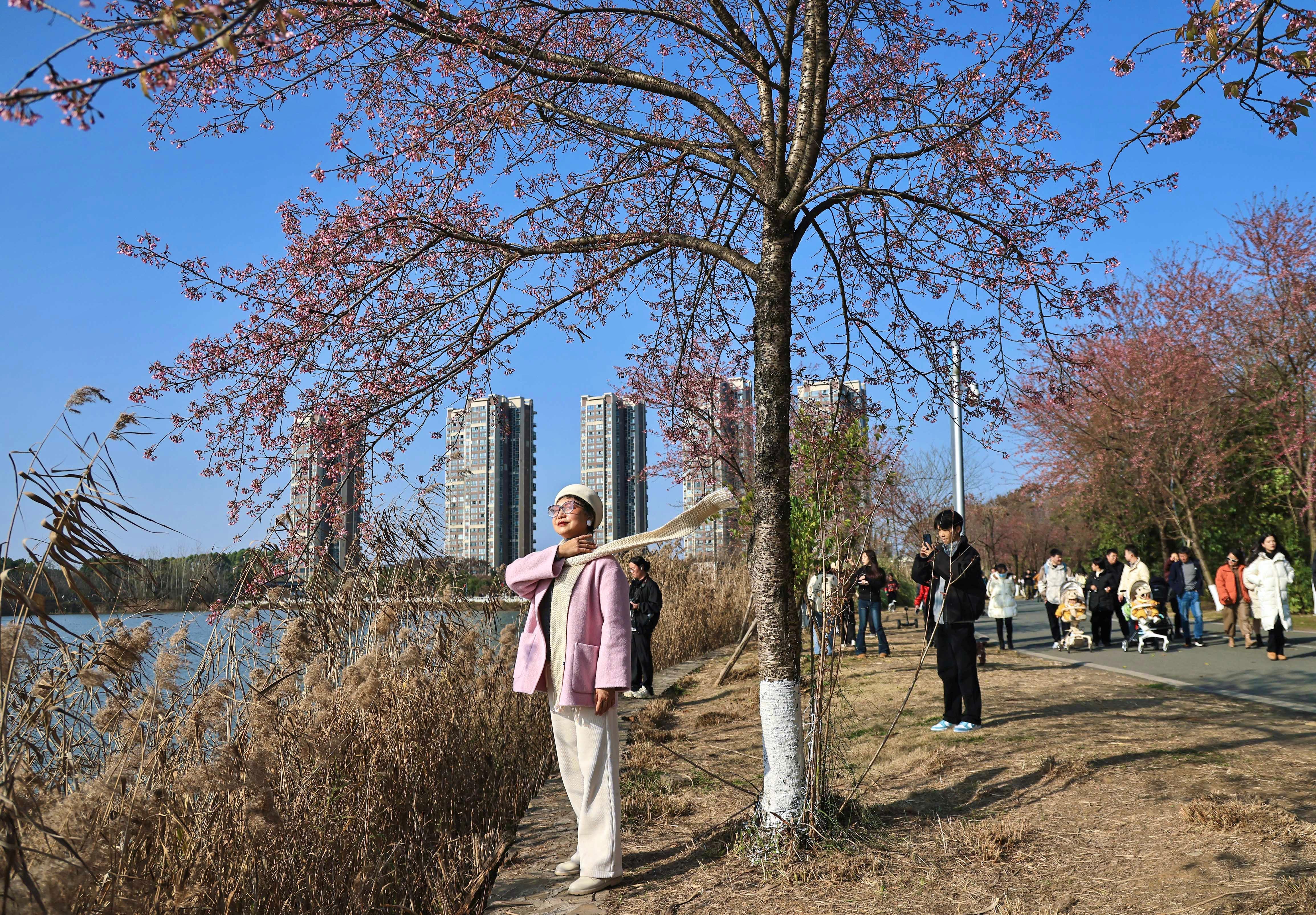 1月6日,成都市青龍湖公園的冬櫻花開(kāi)放,吸引游人前來(lái)賞櫻花、享暖陽(yáng)。圖為市民在櫻花樹(shù)下擺姿拍照。中新社記者 王磊 攝
