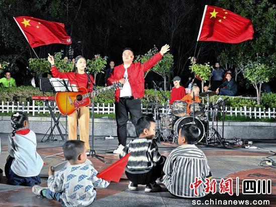 中新網四川新聞9月30日電 (曾媛)“咚!咚!咚!……”29日傍晚,廣元市朝天區(qū)大中壩廣場的夜空被清脆的手鼓聲打破。舞臺上,幾位身著紅色衛(wèi)衣的表演者輕擊手鼓,伴著悠揚笛聲,緩緩唱響《紅山果》。臺下,一群手舉小紅旗的兒童踩著節(jié)拍蹦跳歡呼,一場融合情景表演與多元藝術的群眾文化展演在璀璨燈火中拉開帷幕。