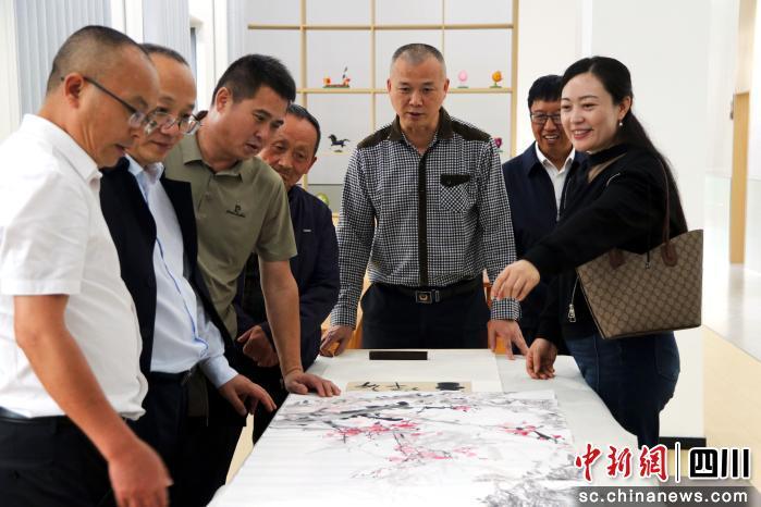 分享會后走進該縣文化館臨展廳,泥塑、面塑等非遺作品與書法、繪畫等藝術作品異彩紛呈,融合出獨具特色的西充文化!皣勒言O壬淖髌穾е鴿庥舻募亦l(xiāng)情懷,書法界評價其作品‘線條似苕藤,墨點似苕葉,字形似苕塊,作品似苕田’……”講解員娓娓道來,參觀者在各個展品前駐足品味,沉浸在這片土地深厚的文化底蘊中。