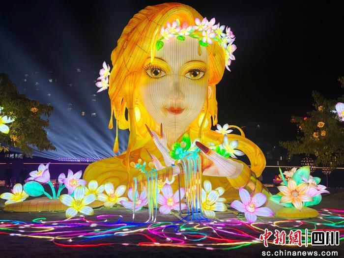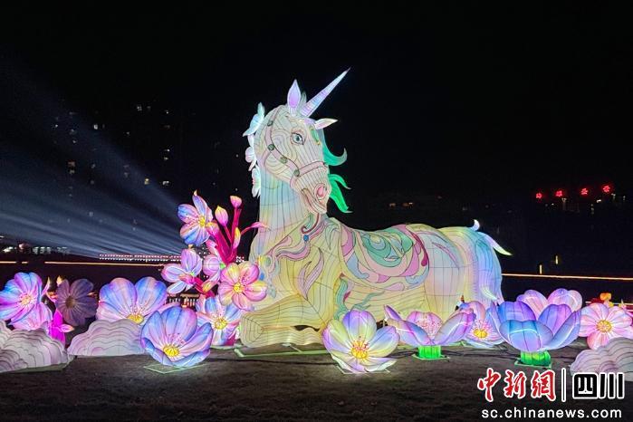 燈會(huì)現(xiàn)場(chǎng)移步換景,各類(lèi)燈組特色鮮明!榜R躍迎新春”“馬上開(kāi)花”等燈組營(yíng)造出濃厚年味兒;“幸福丹棱年”走馬燈組旋轉(zhuǎn)變換,盡顯小城煙火氣;“登大雅之堂”詩(shī)詞書(shū)法燈組,彰顯丹棱“有容乃大、和美為雅”的文化內(nèi)核;“橙風(fēng)破浪”“功橙名就”等燈組,取材于“桔橙俠”“媛幺妹”等丹棱桔橙IP,融合產(chǎn)業(yè)特色與創(chuàng)意;9米高的“橘頌天香”橘子女神燈組則成為熱門(mén)打卡點(diǎn)。燈籠、詩(shī)詞燈串、橘燈漫徑點(diǎn)綴其間,市民游客沉浸式感受光影與節(jié)慶魅力。