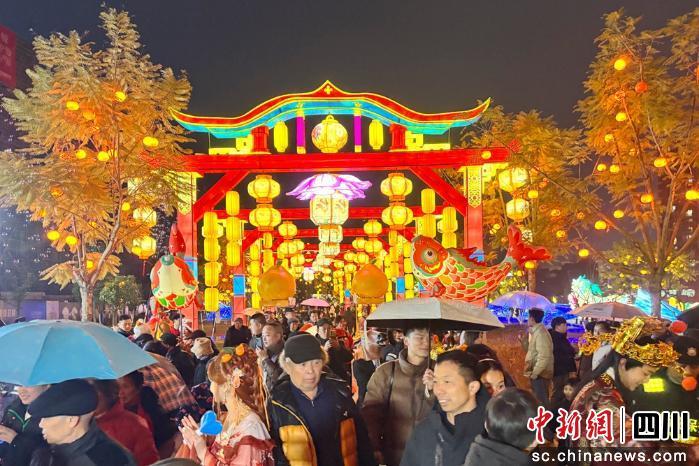 中新網(wǎng)四川新聞2月8日電 (劉忠俊 劉丁源)2月7日晚,眉山市丹棱縣首屆橘橙新春國(guó)潮燈會(huì)正式開(kāi)燈,儀式現(xiàn)場(chǎng)12名嗩吶藝人乘竹筏一字排開(kāi),高亢嘹亮的嗩吶聲劃破夜空,上千盞彩燈同步點(diǎn)亮,千余名市民游客現(xiàn)場(chǎng)共賞盛景、同迎新春。